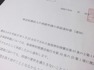 | 承認申請 | 相談窓口は所轄国税局(正式な申請書の提出先は所轄税務署長) | 1.寄附行為又は定款の写し 2.申請時の直近に終了した事業年度に係る厚生労働大臣の定める基準を満たす旨の証明書 (都道府県知事より交付) 3.申請者の医療施設等の明細表 4.承認要件を満たす旨を説明する書類 5.申請者の理事、監事及び評議員等に関する明細表 6.申請者の経理等に関する明細表 |